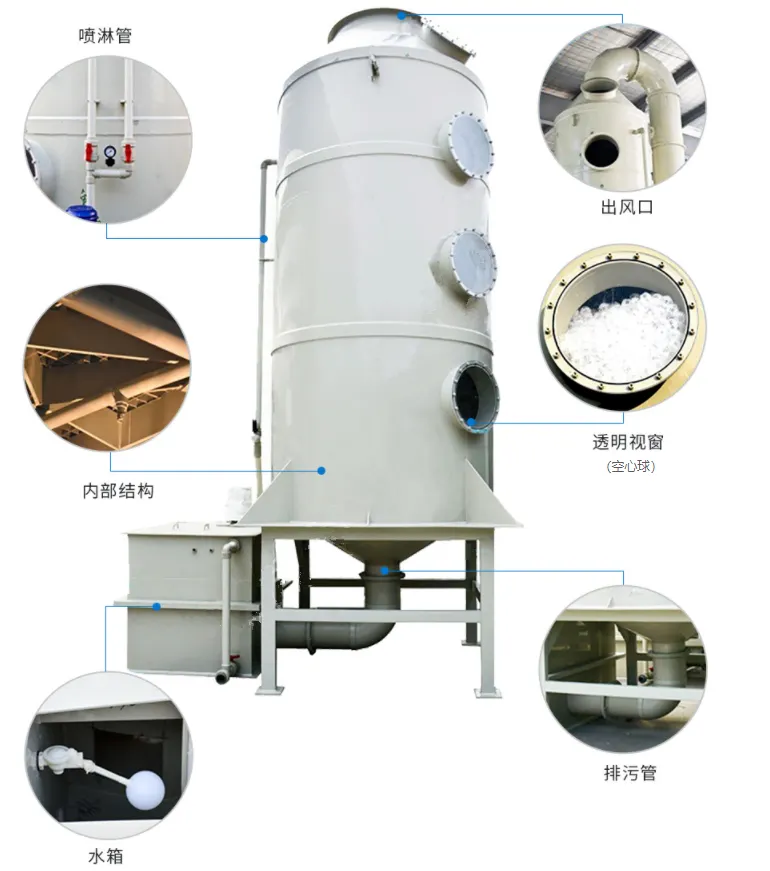 噴淋塔設備主要是由進氣口,出氣口、檢修口、塔體(吸收塔)、填料層、噴淋層、藥液儲存投加系統、循環水箱等零件組成,吸收塔是整個噴淋塔的吸收核心。工業廢氣從吸收塔進入,在噴淋層與填料(根據不同的廢氣成分配置)發生化學反應,可去除廢氣中含有的有毒有害的廢氣,經過一級凈化后的氣體送達碳纖維進行吸附,最后達標排放于大氣層中。