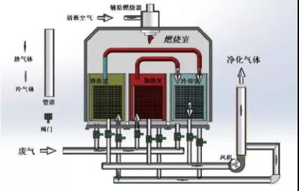 RTO把有機廢氣加熱到760攝氏度以上,使廢氣中的VOCs在氧化分解成二氧化碳和水。氧化產生的高溫氣體流經特制的陶瓷蓄熱體,使陶瓷體升溫而“蓄熱”,此“蓄熱”用于預熱后續進入的有機廢氣,從而節省廢氣升溫的燃料消耗。陶瓷蓄熱體應分成三個(含三個)以上的區或室,每個蓄熱室依次經歷蓄熱-放熱-清掃等程序,周而復始,連續工作。蓄熱室“放熱”后應立即引入部分已處理合格的潔凈排氣對該蓄熱室進行清掃(以保證VOC去除率在99%以上),只有待清掃完成后才能進入“蓄熱”程序。RTO蓄熱式廢氣處理設備,運行費用省,有機廢氣的處理效率高的優點,適應廢氣濃度1000~10000mg/m3,分解效率:99%—99.5%。是目前較為經濟可靠的達到50mg/m3嚴格的排放標準的VOCs治理技術,得到了廣泛的應用。