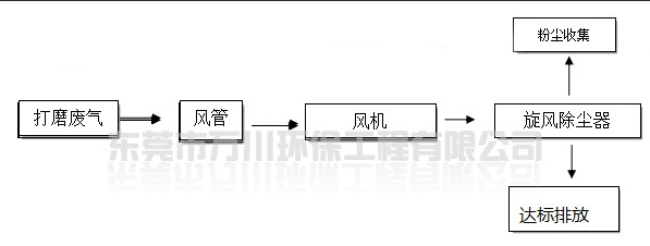 二樓的切削打磨屬于粉塵廢氣,打磨拋光時所產生的粉塵通過收集由引風機抽至車間外。本方案設計設粉塵廢氣處理系統二套,處理能力為15000m3/h,系統設于車間一樓。